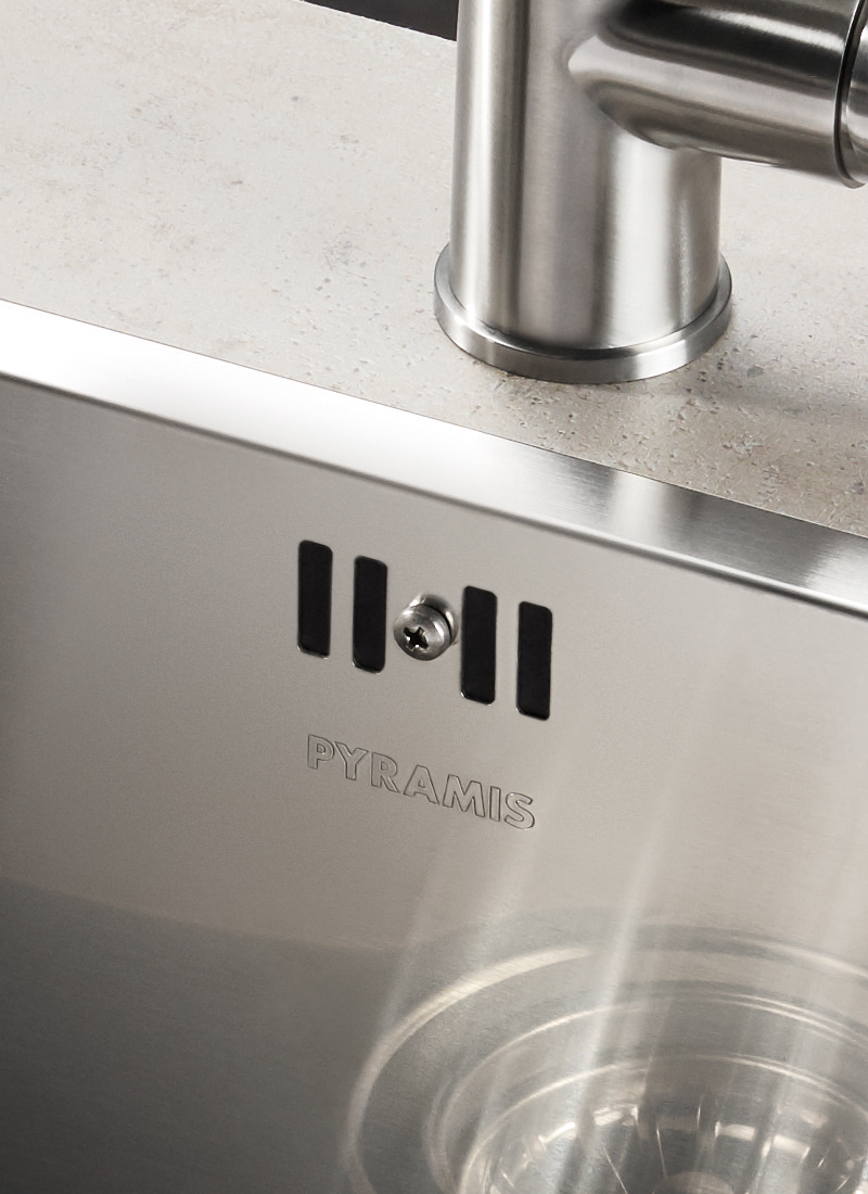 Aby uzyskać uszczelnienie przed wodą, należy umieścić uszczelniacz między zlewem a blatem. Aby ułatwić montaż, wszystkie zlewozmywaki PYRAMIS ze stali nierdzewnej są wyposażone w fabrycznie zainstalowany uszczelniacz z poliuretanu pod zlewem (ŁATWA NAPRAWA).